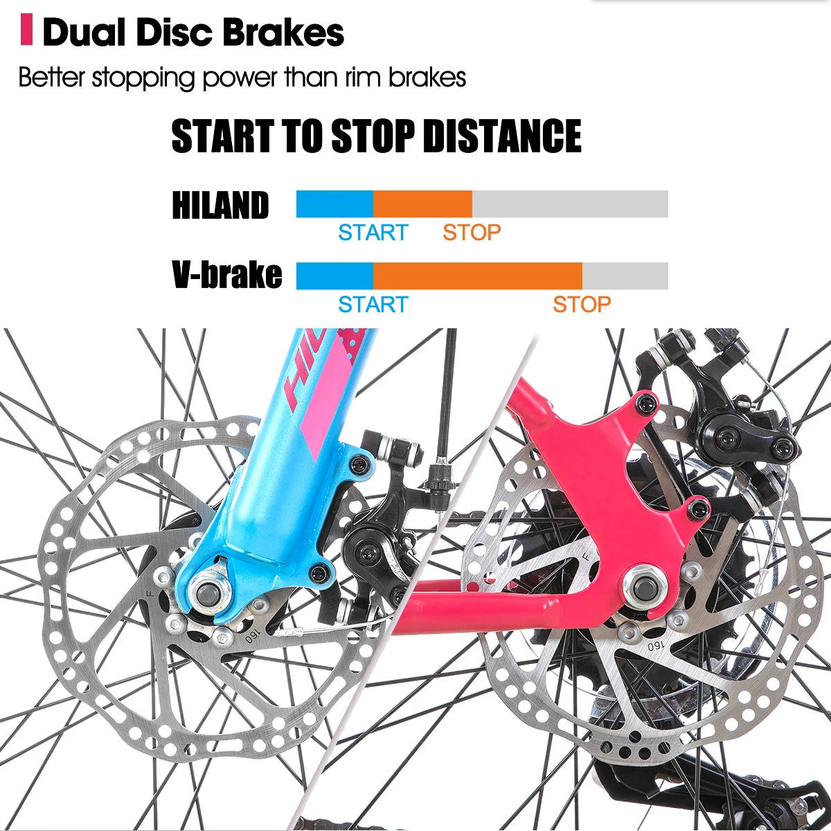 Introducing the Hiland 26 Inch Women's Mountain Bike, designed specifically for female riders who seek adventure and versatility on every trail. With a robust construction and advanced features, this bike stands out in the mountain bike category. It boasts a Shimano 21 Speed gear system, allowing you to tackle any incline with ease while enjoying a smooth ride on varied terrains.